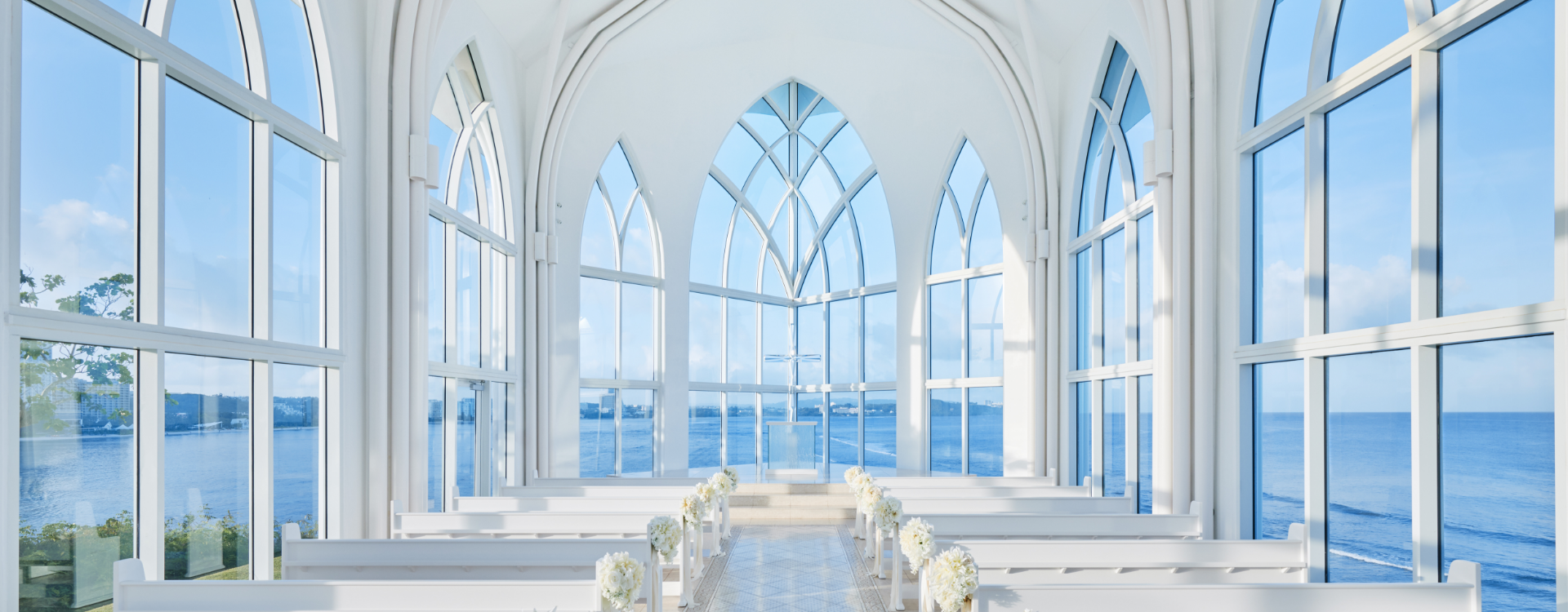 祭壇へとまっすぐ伸びるバージンロードは、青空を写し、まるで海の上を歩いているよう。