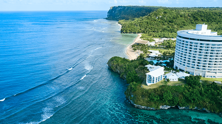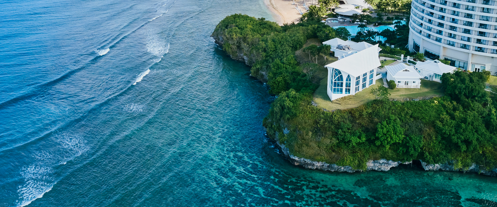 タモン湾を一望する高台にあるヴィレッジスタイルの挙式場はグアムでも最も美しいオーシャンフロントウエディングの一つです。