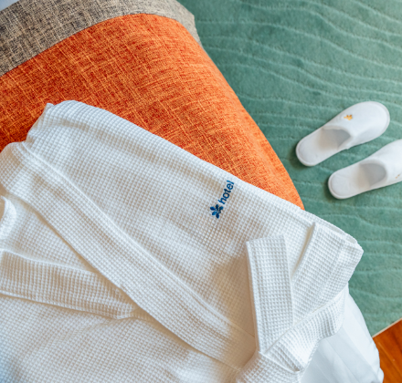 着心地のいいオリジナルのバスローブをご用意しております。優雅なルームステイをお過ごしください。